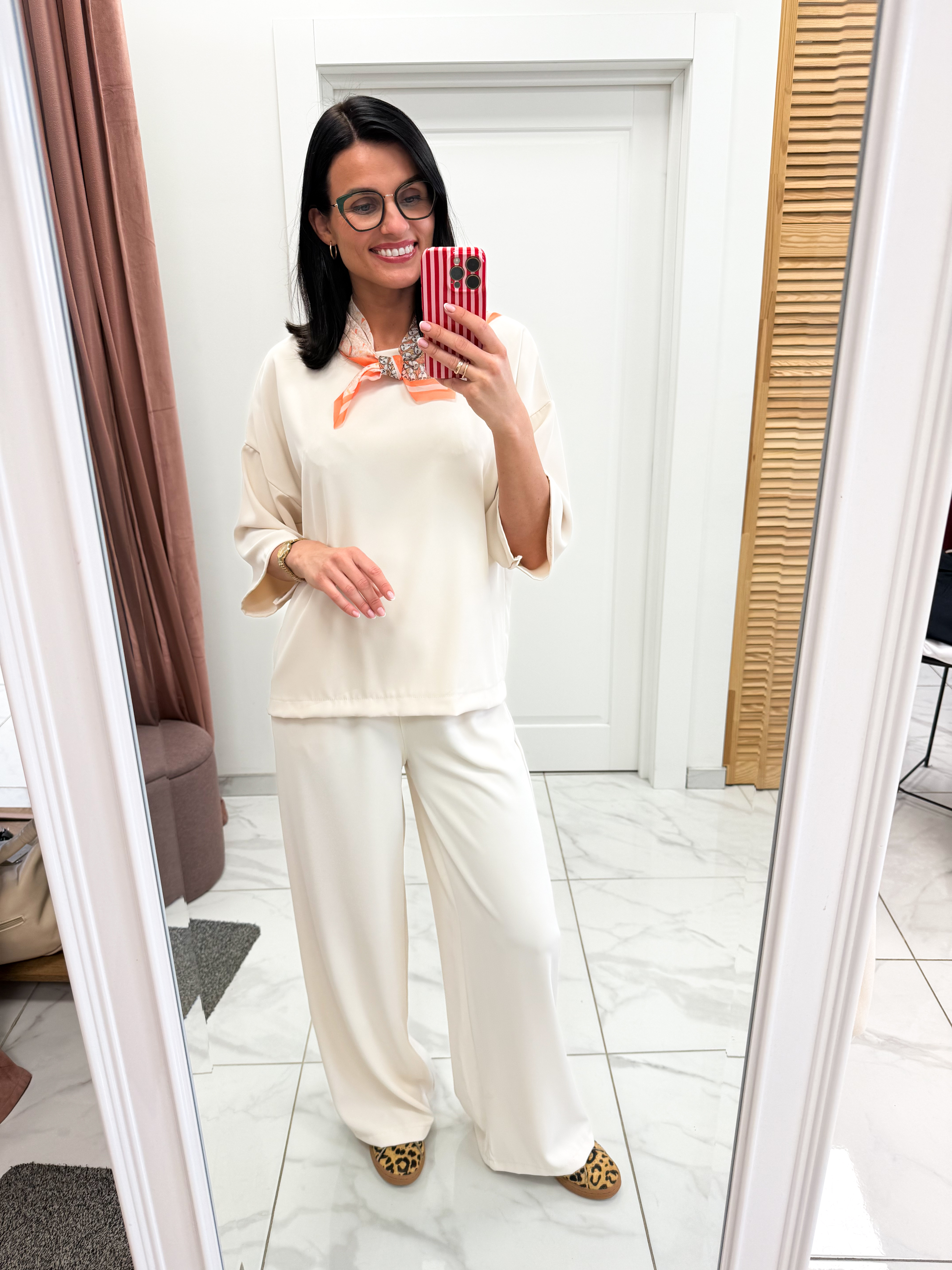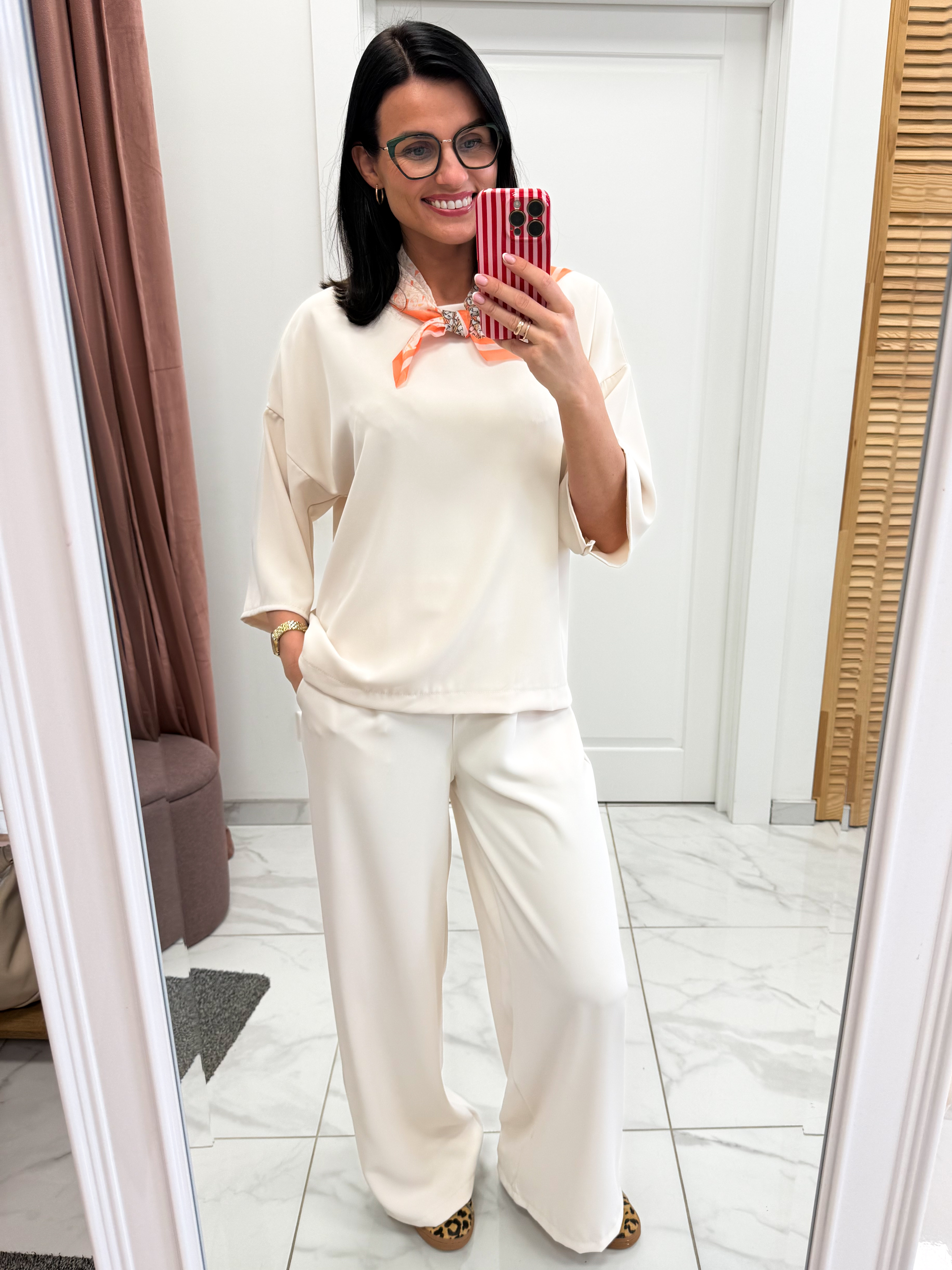 Stilingas ir labai patogus, itališkas palaidinės ir kelnių komplektas su stilinga skarele.
