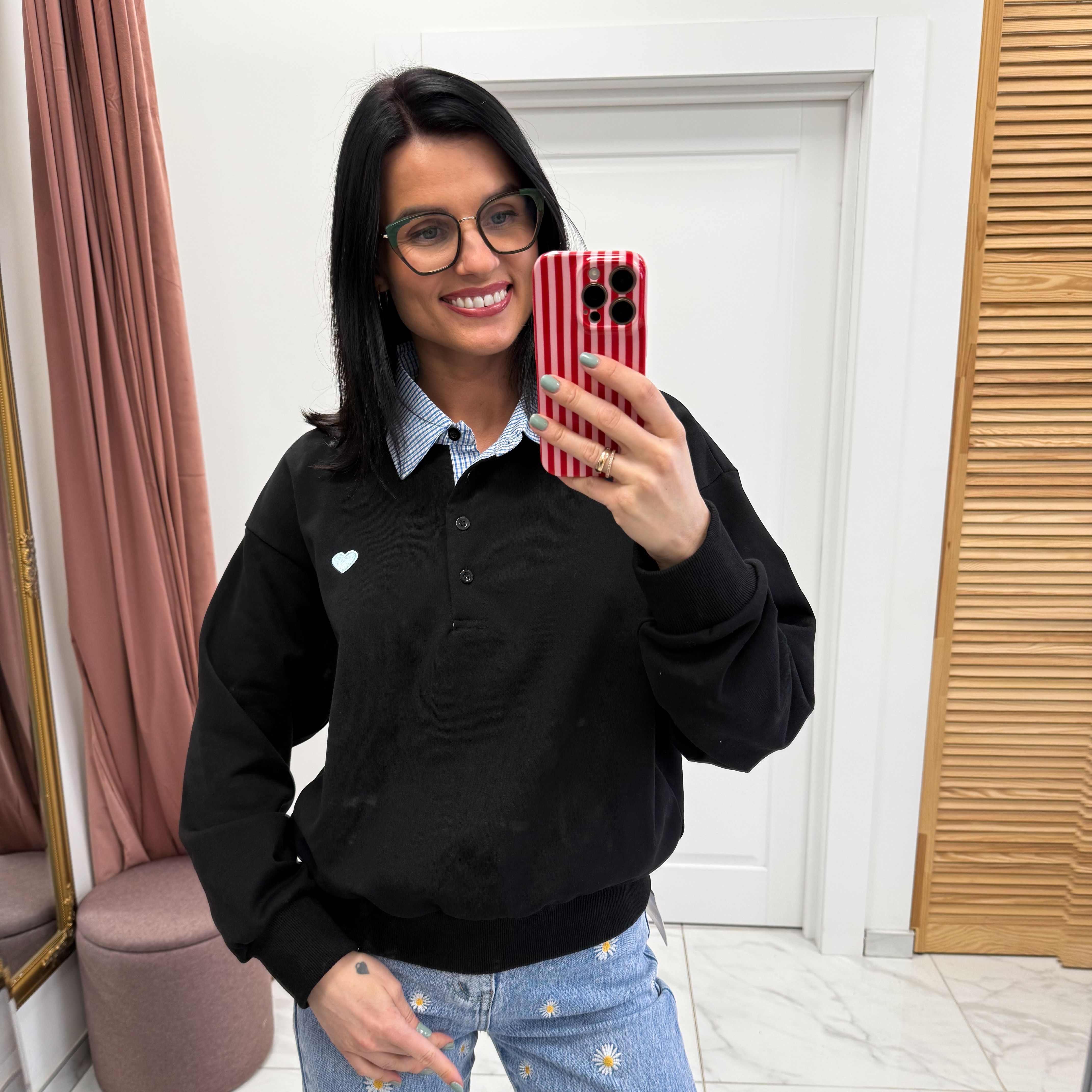 Stilingas ir labai švelnus prie kūno, kilpinio trikotažo megztukas, dekoruotas marškinių apykakle.