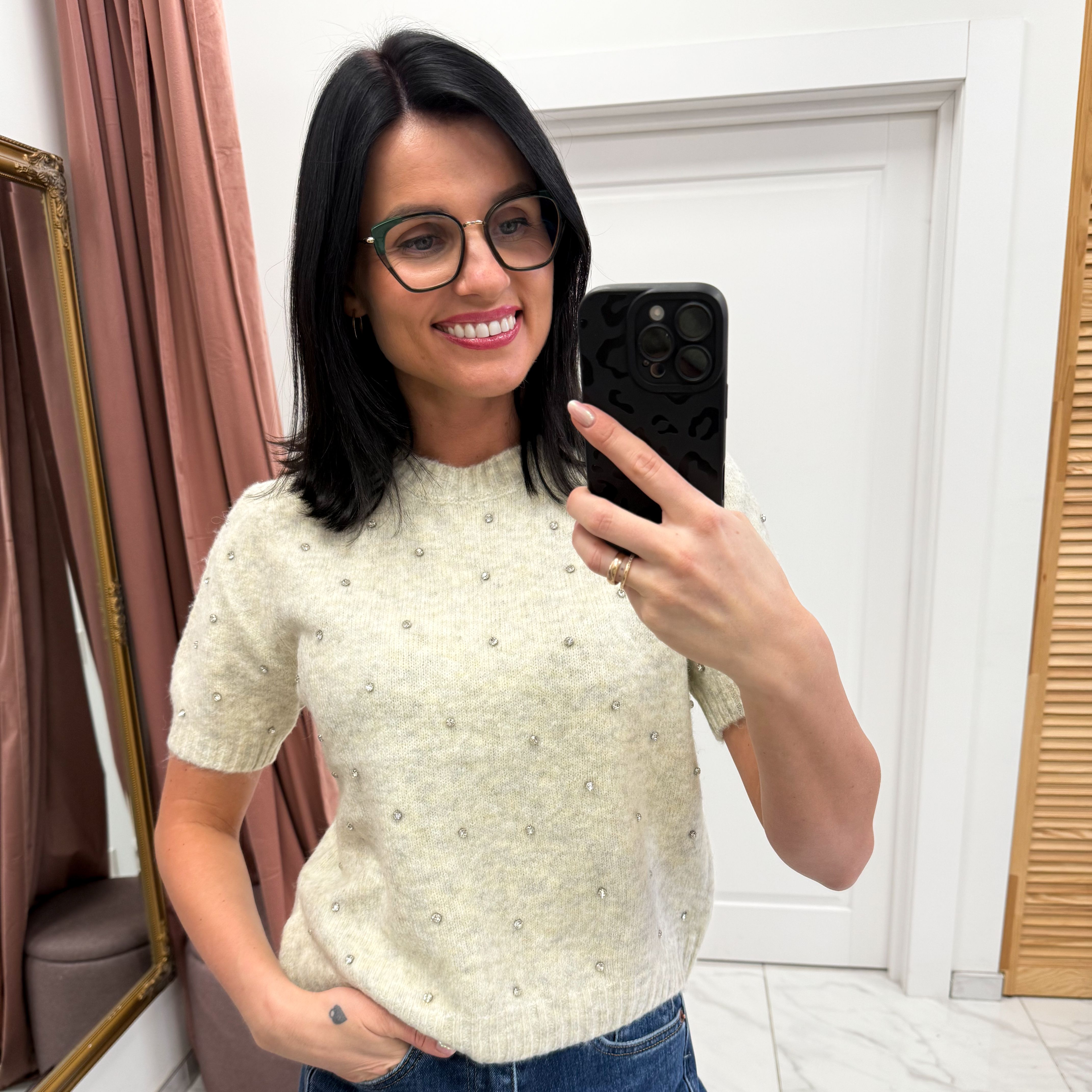 Stilingas ir labai švelnus prie kūno megztukas su lamos vilna, dekoruotas blizgiomis akutėmis.