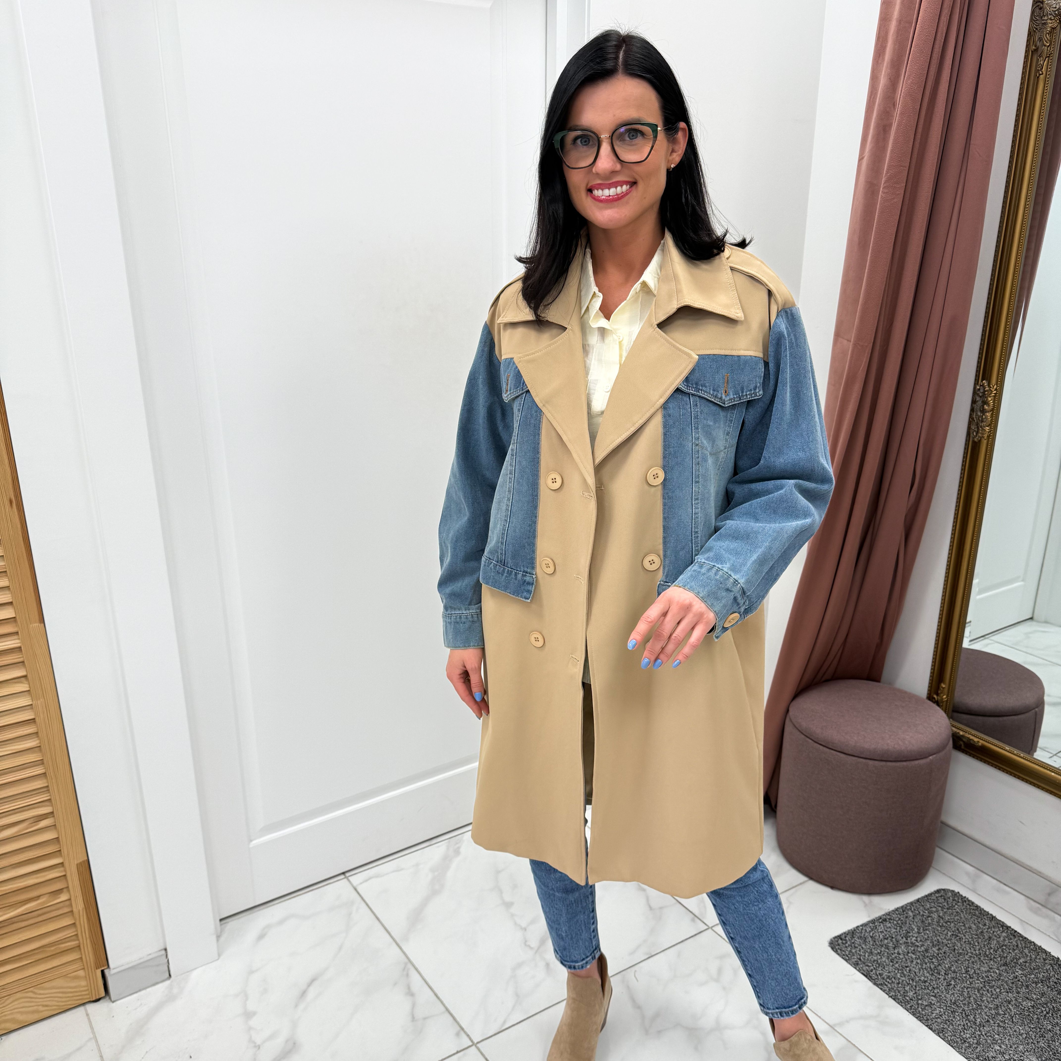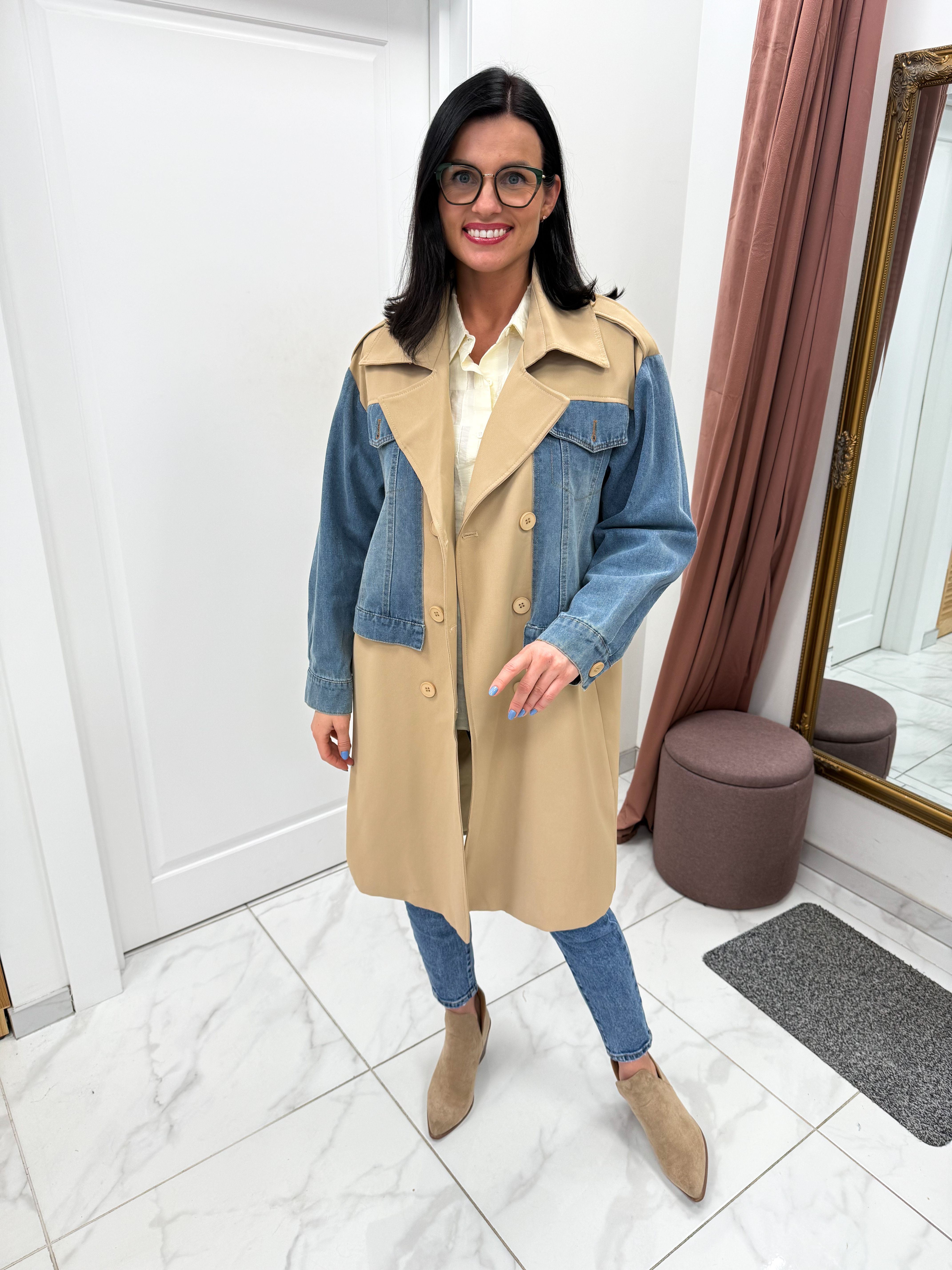 Stilingas, išskirtinis, itališkas paltas, dekoruotas džinso detalėmis.