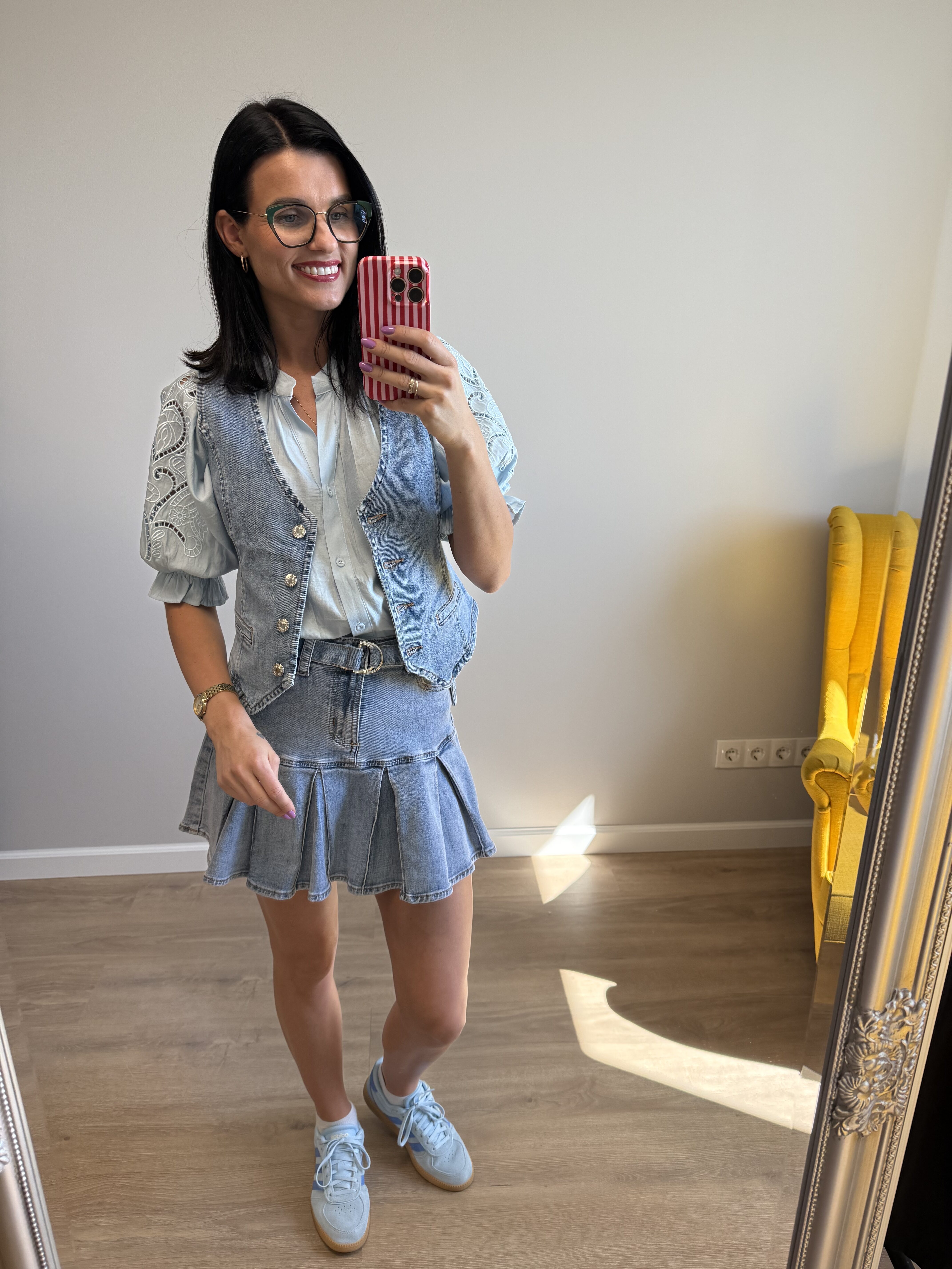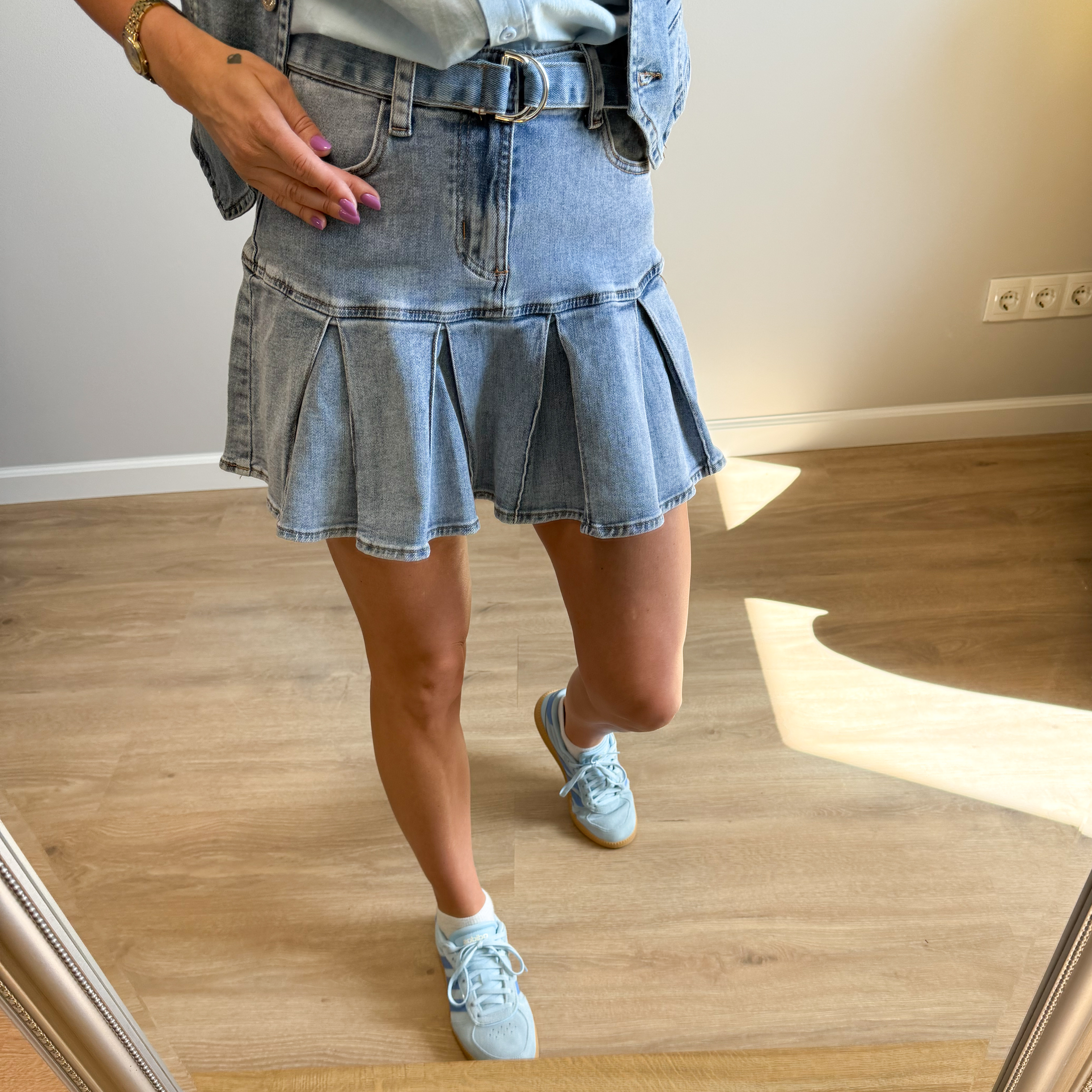 Stilingi ir labai patogūs, elastingo džinso sijonai su dirželiu per liemenį.